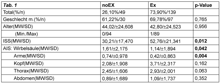 Ergebnisse: Tabelle 1 [Tab. 1] zeigt die Demographie und Verletzungsschwere. Signifikante Unterschiede ergaben sich bei Verletzungsschwere und verletzter Körperregion. Der Unfallhergang zeigte keine Differenzen.