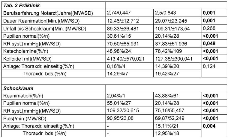 Aus Tabelle 2 [Tab. 2] wird ersichtlich, dass sowohl Erfahrung als auch präklinische Dauer der Reanimation sowie Blutdruck, Pupillenstatus und verabreichte Medikamente Informationen über das Outcome geben, während die präklinische Dauer nicht signifikant ist. Bei der Schockraumversorgung zeigen sich die Reanimationspflichtigkeit sowie Vitalwerte bedeutend.