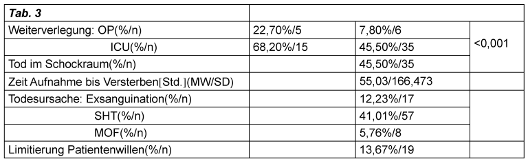 Diskussion und Schlussfolgerung: 26% der Reanimationen verliefen erfolgreich. Entscheidend hierbei ist ein Zusammenspiel vieler Parameter. Schwere Verletzungen, insbesondere im Bereich des Schädels sowie die Exsanguination haben eine schlechte Prognose.