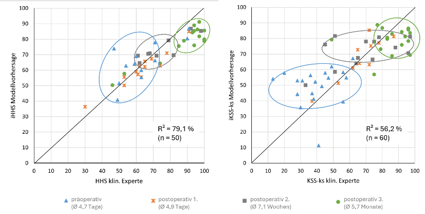 Anhand eines repräsentativen Gangzyklus [4] jedes Patienten und dem vortrainierten Modell aus [3] wurde der jeweilige instrumentelle Score (iHHS oder iKSS-ks) berechnet. Zur Untersuchung der Vorhersagegenauigkeit wurden Parameter der deskriptiven Statistik, die Interrater-Varianz, wie in [2] beschrieben, und das Bestimmtheitsmaß herangezogen.