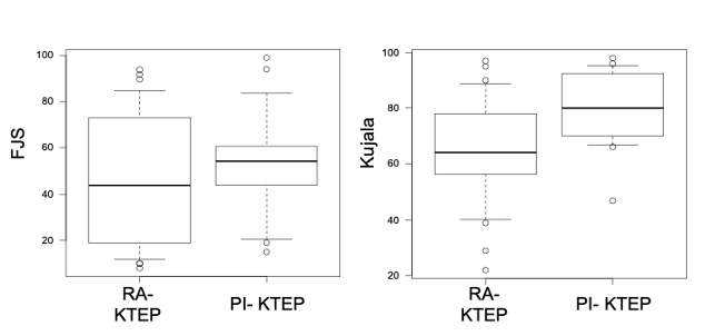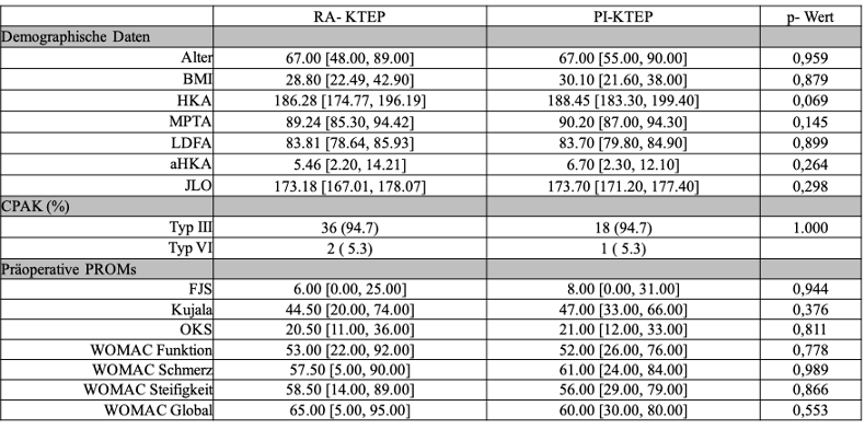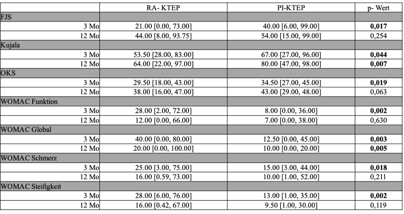 Ergebnisse: Insgesamt konnten 71 Patienten mit vollständigen PROM-Daten 12 Monate postoperativ nach mit o.g. Kriterien identifiziert werden. Nach 2:1 Matching verblieben 57 Patienten für den Gruppenvergleich (RA-KTEP n=38, PI-KTEP n=19). Es konnte eine hohe Vergleichbarkeit der Gruppen in Bezug auf Alter, BMI und anatomische Variablen und präoperative PROMs erzielt werden (siehe Tabelle 1 [Tab. 1]). 3 und 12 Monate postoperativ zeigten sich verbesserte klinische Scores für PI- KTEP, wobei insbesondere der Kujala- Score nach 3 und 12 Monaten deutliche bessere Ergebnisse (3 Monate: 53,5 vs. 67,0, p=0.04; 12 Monate: 64,0 vs. 80,0, p=0,007) zeigte (Tabelle 2 [Tab. 2]).