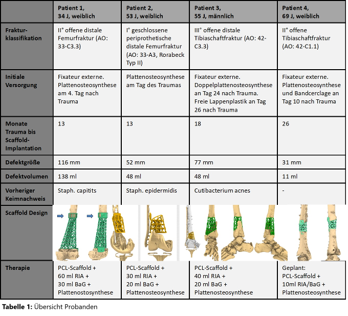 Material und Methoden: In diese monozentrische, prospektive Studie wurden zum Zeitpunkt der Abstract-Einreichung 4 Patienten (Pat.) mit großen Knochendefekten der unteren Extremität mit patientenindividuellen 3D-gedruckten PCL-Scaffolds, autologer Knochentransplantation mit Femurmarkraumaspirat (RIA), sowie BaG als Graftexpander eingeschlossen (Tabelle 1 [Tab. 1]). Die Nachsorge erfolgte 1, 6, 12 Wochen (Wo), sowie 6, 12 und 24 Monate (Mo) postoperativ (po). Knöcherne Konsolidierung wurde mittels Röntgen (bis inkl. 12 Wo po) und CT (ab 6 Mo po) bewertet. Graftperfusion und Neoangiogenese wurde mit kontrastmittelverstärktem Ultraschall (CEUS) und kontrastmittelverstärktem MRT (DCE-MRT) beurteilt. Außerdem wurden Fragebögen zur Lebensqualität (SF-12, EQ-5D-5L, Schmerzen) und Mobilität (lower extremity function score; LEFS), Blutanalysen, Wiederaufnahme der Arbeit und Zeitpunkt der Vollbelastung beurteilt. Insgesamt sollen 20 Pat. eingeschlossen werden.