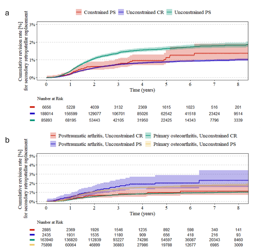 Ergebnisse: In die Studie wurden 280.563 Patienten eingeschlossen. Das Risiko für einen sekundären Retropatellarersatz war bei PS- und CCK-Designs signifikant höher als bei CR-Designs (Abbildung 1a [Abb. 1], p<0,01). Dieser Trend war sowohl für die primäre als insbesondere auch für die posttraumatische Situation zu beobachten (Abbildung 1b [Abb. 1], p<0,01). Bei 41% der sekundären RPE wurde zusätzlich ein Inlaywechsel durchgeführt, wobei in 71% der Fälle die Inlayhöhe verändert wurde. Eine verbesserte Re-Revisionsrate ließ sich durch diese Maßnahmen im kurz- bis mittelfristigen Follow-up nicht nachweisen (p=0,5 und p=0,4).