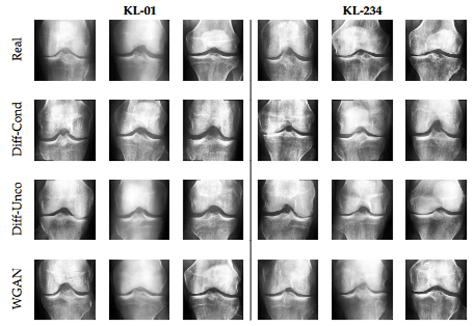 Discussion and conclusions: This study shows that DDPMs can generate high-fidelity synthetic knee osteoarthritis X-rays, outperforming GANs in realism and utility for DL training. Future research should explore higher-resolution or 3D imaging, alternative conditioning methods, and safeguards against memorization. Generative models could also aid clinical decision-making by simulating progression and treatment effect visualization. DDPMs offer a promising approach to medical image synthesis, addressing data limitations and enhancing DL diagnostics with ethical and practical integration.