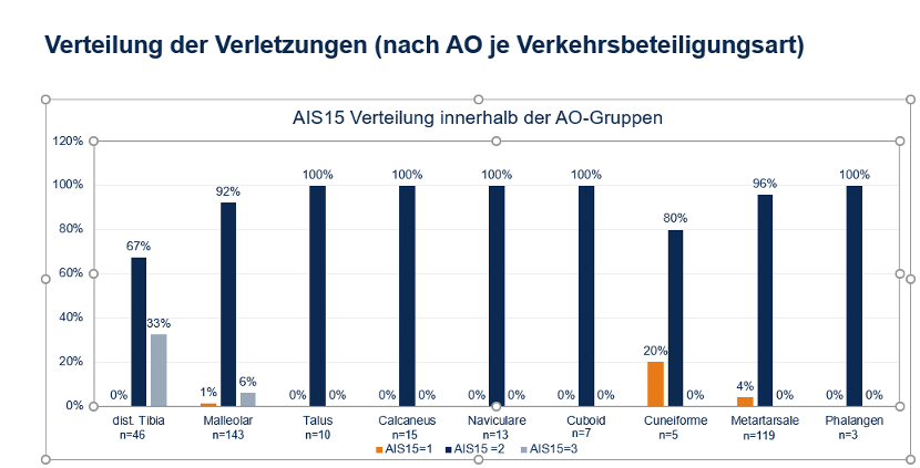 Zielsetzung und Fragestellung: Verletzungen des oberen Sprunggelenkes (OSG) und Fußes (FSGV) zählen mit einer Inzidenz von > 174/100.000 zu den häufigsten Frakturen (Fx). FSGV und ihre Folgen führen zu erheblicher Morbidität. Unfallmechanismus, Weichteilschaden, assoz. Bandverletzungen, Vorerkrankungen und Geschlecht sind prädiktive Faktoren. Ca 20% der FSGV resultieren aus Verkehrsunfällen (VU). Basierend auf detaillierter VU- forschungs- und klin. Daten nach verschiedenen Verkehrsteilnehmern sollen diff. potenzielle Einflussfaktoren auf die FSGV-Inzidenz detektiert werden.