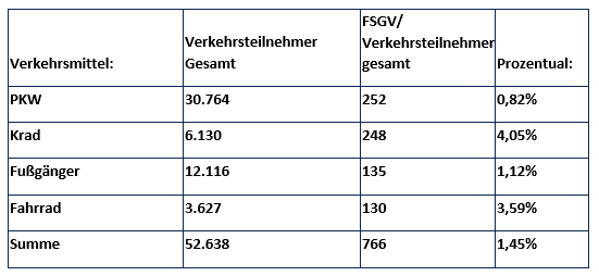 Diskussion und Schlussfolgerung: FSGV im Straßenverkehr treten bei 1,5% aller VU mit Personenschaden (KRAD und FR: 4,1/3,6%) auf und führen zu erheblicher Morbidität. Prädiktive Faktoren wie Alter, Geschlecht und Hauptanprall scheinen nicht beeinflussbar. Das FSGV-Risiko signifik. triggernde Einflussgrößen, wie erhöhte Geschwindigkeit und Nichtnutzung des Anschnallgurtes aber sind fahrlässig und absolut vermeidbare Risikofaktoren. Ausgehend von diesen Unfall- und Verkehrsmittel-/-teilnehmer-spezifischen individuellen FSGV-Riskofaktoren können differenzierte präventive Konzepte für Fahrzeugsicherheitssysteme weiterentwickelt werden, zumal seit 2011 die PKW-Sicherheitsentwicklung zu keiner relevanten Risikoreduktion für FSGV geführt hat.