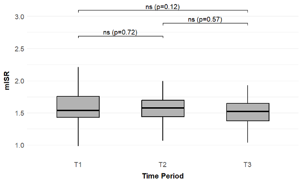 Figure 1: Comparison of the modified Insall-Salvati Ratio (mISR) immediately before Revision from unicompartmental (UKA) to total knee arthroplasty (TKA) (T1), One Week after Revision from UKA to TKA (T2), and at last Follow-up after Revision from UKA to TKA (T3).
