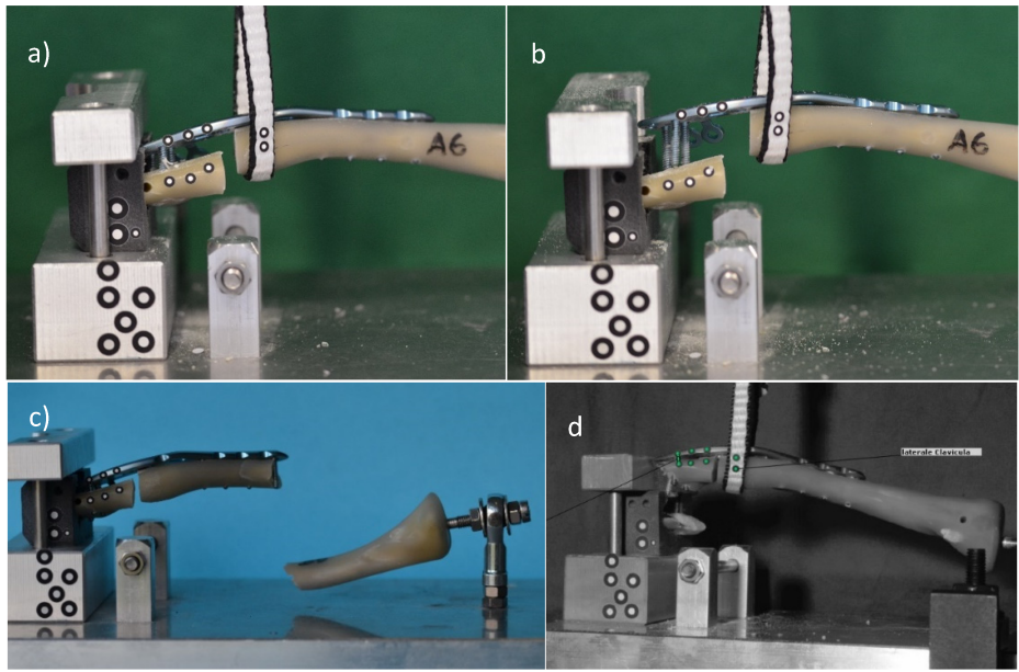 Abbildung 1: Gezeigt werden die unterschiedlichen Versagensarten: Lockerung (a) und Schraubenausriss (b) aus dem lateralen Fragment; c) Fraktur am medialen Plattenende; d) laterale Fraktur.