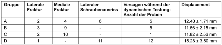 Ergebnisse: Die Versagensmodi in der dynamischen und statischen Testphase aller 4 Gruppen sind in Tabelle 1 [Tab. 1] aufgelistet und in Abbildung 1 [Abb. 1] dargestellt. Je mehr Fixierung des lateralen Fragmentes über zusätzliche anteriore Schrauben und ein CC-Banding (Gruppe C) erfolgt, desto mehr Proben standen die dynamische Testphase durch und desto eher trat ein Versagensmodus auf der medialen Plattenseite auf. Das höchste Displacement nach der dynamischen Testphase wies Gruppe D auf (p=0,02 im Vergleich zu Gruppe C).