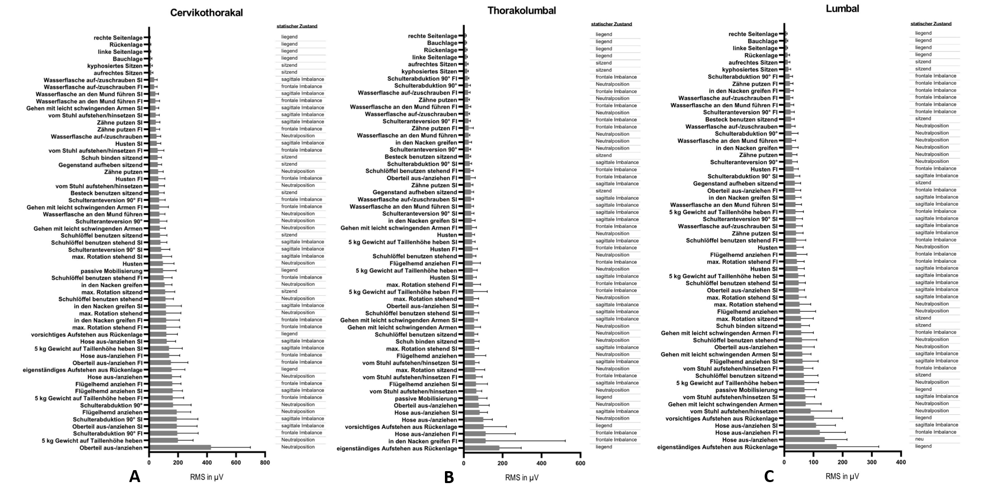 Material und Methoden: Cervikothorakal, thorakolumbal sowie lumbal wurde prospektiv bei 20 freiwilligen gesunden jungen Proband:innen ein Oberflächen-Elektromyogramm installiert. Insgesamt 59 verschiedene alltägliche Bewegungen, welche im Rahmen einer regulären postoperativen Mobilisation oftmals stattfinden, wurden sodann durchgeführt und es wurde währenddessen die Muskelaktivität an den drei genannten Ableitungen gemessen. Die untersuchten Bewegungsabläufe (z.B. Zähne putzen, Schuhe binden etc.) fanden entsprechend in liegender, sitzender oder stehender Position statt. Darüber hinaus wurde mittels einer eigens 3D-gedruckten Apparatur auch eine sagittale sowie frontale Imbalance simuliert und deren Auswirkung auf die Aktivierung der Rückenmuskulatur untersucht.