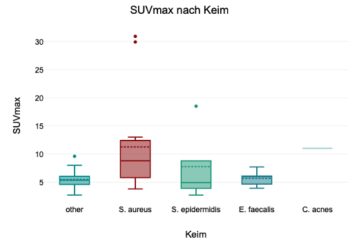 Ergebnisse: Insgesamt gab es 42 Fälle mit einem PET-CT. Hiervon erfolgte der Nachweis von S. aureus 38,1% (n=16), E. faecalis 14,3% (n=3), S. epidermidis 11,9% (n=5), C. acnes 4,76% (n=2) und anderer oder kein Keimnachweis 30,95% (n=13). Das durchschnittliche SUVmax lag bei 8,33±6,14. Wir konnten einen signifikanten Unterschied zwischen den verschiedenen Keimen nachweisen (p=0,024) (Abbildung 1 [Fig. 1]). Insbesondere zeigte sich ein signifikant höherer SUVmax bei Nachweis eines S. aureus 8,8 (3,8 – 18,5) im Vergleich zu allen anderen Keimen oder keinen Keimnachweis 5,64 (2,7 – 18,5) (p=0,009).
