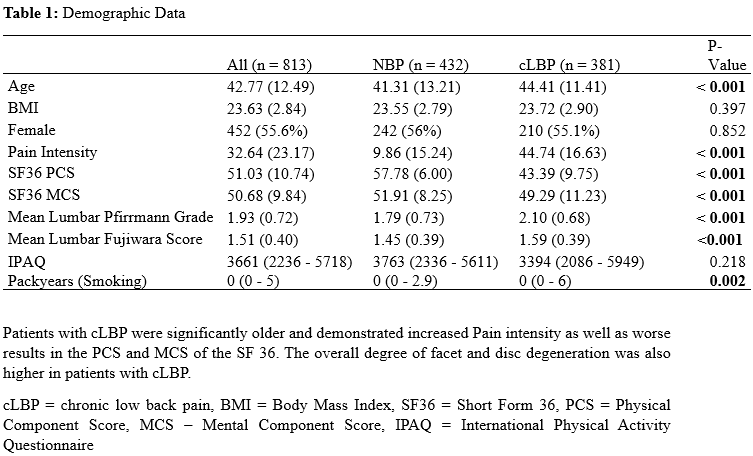 Objectives and questions: The relationship between degenerative changes in the lumbar spine and chronic low back pain (cLBP) remains controversial. While lumbar degeneration is more common in symptomatic patients, its role in pain and disability is described inconsistently. We hypothesize that the association between spinal degeneration and pain, as well as disability, is more pronounced in younger patients, necessitating an age-specific analysis.