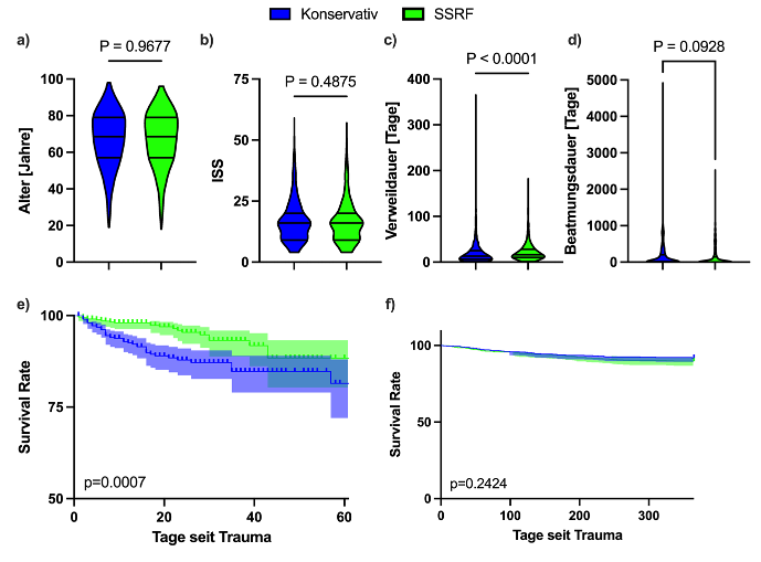 Diskussion und Schlussfolgerung: Die Daten zeigen, einen Vorteil der SSRF hinsichtlich Krankenhausmortalität und Beatmungsdauer im Vergleich zum konservativen Vorgehen. SSRF war jedoch im Einklang mit der Datenlage in der Literatur mit einer längeren Krankenhausverweildauer assoziiert.