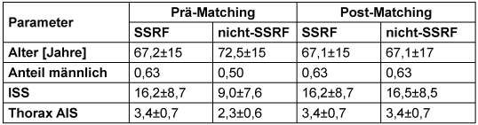 Ergebnisse: Es konnten nach dem Matching insgesamt 532 Patienten mit SSRF und 532 Kontrollpatienten eingeschlossen werden. Tabelle 1 [Tab. 1] zeigt die demographischen, ISS und AIS-Daten vor und nach Matching. Nach dem Matching waren die Gruppen vergleichbar. Die Verteilung von Alter und AIS post-Matching sind in Abbildung 1a-b [Abb. 1] gezeigt.