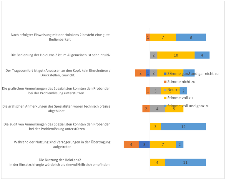 Ergebnisse: An der Studie nahmen 16 Probanden teil (chirurgisch tätige Assistenzärzte n=13 und allgemeinchirurgische Fachärzte n=3). Die Ergebnisse zeigten eine hohe Akzeptanz der Verwendung der HoloLens 2 aufgrund intuitiver Bedienbarkeit nach erfolgter Einweisung und überwiegend gutem Tragecomfort. Beim aktuellen Technikstand war insbesondere die audiovisuelle Interkation maßgeblich für die Operationsunterstützung. Herausforderungen zeigten sich noch in der Präzision grafischer Annotationen, sowie dem Auftreten von Übertragungsverzögerungen. Insgesamt wurde die Erfahrung der interaktiven Operationsunterstützung als positiv bewertet.