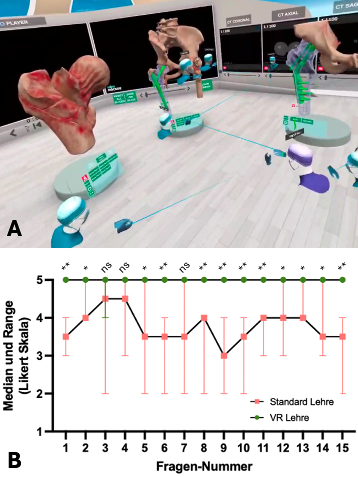 Abbildung 1: A: In der virtuellen Umgebung können Teilnehmer sich frei bewegen, Knochenstrukturen ausblenden und CT-Schichten direkt am Modell nachvollziehen. B: Ergebnisse der Fragebögen, dargestellt als Median und Range für jede der 15 Fragen (Likert-Skala von 1 bis 5). Rote Quadrate = Standard-Lehre; grüne Kreise = VR-Lehre; ns = nicht signifikant; * = p < 0,05; ** = p < 0,01.
