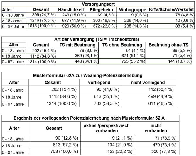 Einleitung: In Deutschland werden je nach Schätzung zwischen 15.000 bis 25.000 Menschen in Form der außerklinischen Intensivpflege (AKI) versorgt. Davon werden rund 40 Prozent der Patienten/-innen invasiv und rund 22 Prozent teilweise oder durchgängig nichtinvasiv beatmet [1]. Die im Einzelfall, vor allem auch im Hinblick auf die Lebensqualität, indizierte, dann oft prologierte Beatmungsentwöhnung (Weaning) stellt, nicht zuletzt aufgrund häufiger Komorbiditäten, eine komplexe Intervention dar [2], [3], [4], [5], [6]. Deswegen ist eine leitliniengerechte Indikationsstellung mit fachgerechter Erhebung des Potenzials zur Beatmungsentwöhnung und ggf. Dekanülierung unabdingbar. Dementsprechend fordert dies modifiziert auch die AKI-Richtlinie des Gemeinsamen Bundesausschusses (G-BA) für diese Patienten/-innen: sowohl die Dokumentation aller Möglichkeiten der Therapieoptimierung und gegebenenfalls eine Anpassung der Entwöhnungs- bzw. Dekanülierungsstrategie. Die Potenzialerhebung selbst hat durch besonders qualifizierte, durch die Kassenärztliche Vereinigung (KV) beauftragte Vertragsfachärzte/-innen zu erfolgen. Die sozialmedizinische Indikation zur AKI, deren Qualität sowie die richtlinienkonforme Verordnung sind 1x jährlich durch persönliche Inaugenscheinnahme eines Medizinischen Dienstes (MD) auf der Grundlage einer vom Bundesministerium für Gesundheit genehmigten Begutachtungsanleitung zu überprüfen. Analysiert werden sollte, wie sich dieses Patientenkollektiv zum Zeitpunkt der sozialmedizinischen Begutachtung hinsichtlich eines Weaning- und Dekanülierungspotenzials verhielt.