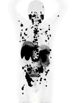 Schlussfolgerung: Die extrem große Diskrepanz der Metastasenlast zwischen den beiden Untersuchungstechniken unterstreicht die überlegene Sensitivität der PSMA-PET/CT bei der Detektion von Skelettmetastasen durch Visualisierung nicht nur osteoblastischer Aktivität, sondern aller PSMA-exprimierenden Zellen. Aufgrund dieser durch die PSMA-PET/CT demaskierte hohe Metastasenlast wurde das Therapieregime geändert und eine Chemotherapie mit Docetaxel 50 mg/m2 q2w für 10 Zyklen statt der eigentlich geplanten Radioligandentherapie mit Radium-223 durchgeführt. Trotz der ausgedehnten Metastasierung war der Patient beschwerdefrei, was auf eine geringe osteoblastische Aktivität bzw. inflammatorische Reaktion hindeuten könnte. Die Befunde betonen die Bedeutung moderner Bildgebungstechniken für eine präzise Behandlungsplanung und Prognoseabschätzung bei Prostatakarzinompatienten.