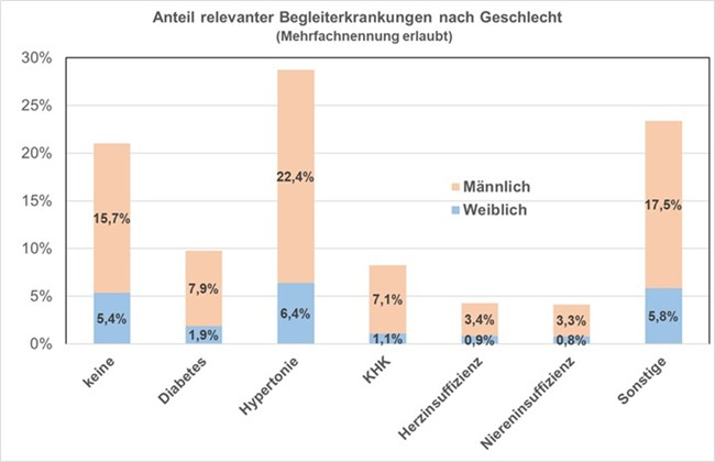 Ergebnisse: Bis August 2024 wurden 1.242 Patienten mit einem Urothelkarzinom im UroNAT-Register dokumentiert. Von den 893 auswertbaren Patienten waren 77% Männer und 23% Frauen mit einem medianen Alter von 73 Jahren (Spannweite 29–95 Jahre). Ein Allgemeinzustand ECOG 0–1 lag bei 90%, bei 10% ein ECOG 2–4. Der mediane body mass index (BMI) betrug 27 (Spannweite 15–63). Die relevanten Komorbiditäten bei > 50% der Pat. sind in Abbildung 1 [Abb. 1] zusammengefasst. Etwa 43% der Patienten waren Nichtraucher. Bei den 57% Rauchern gibt es eine große Varianz von 1–187 Packyears. Eine berufliche Exposition lag bei 8% der Patienten vor. In 68% der Fälle war der Diagnoseanlass eine Tumorsymptomatik (Hämaturie, Miktionsbeschwerden).