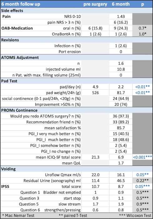 Die OP-Dauer betrug durchschnittlich 54,5 min, das anfängliche Füllvolumen lag bei 6,4 ml. Tabelle 1 [Tab. 1] zeigt alle Ergebnisdaten. Nur eine Revision war notwendig, die Zufriedenheit (PGI-I „viel besser“ oder „sehr viel besser“) erreichte 89,1%. Der Urinverlust ging signifikant zurück, bei 64,9% wurde soziale Kontinenz erreicht. Der Urinverlust betrug nach OP durchschnittlich 81,7 ml/24 h, was hauptsächlich auf 2 Ausreißer (580 ml und 900 ml) zurückzuführen war. Der ICIQ-SF-Score verbesserte sich von 21.3 vor auf 6.9 nach OP. Post-OP