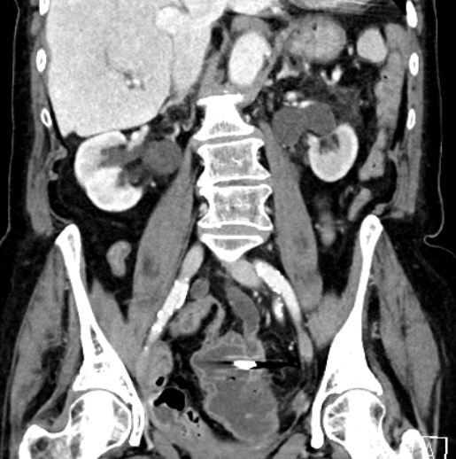 Ergebnisse: In der Akutdiagnostik zeigte sich sonographisch eine Harntransportstörung III° bds., laborchemisch ein akutes Nierenversagen mit einem Kreatinin von 2,3 mg/dl sowie eine beginnende Infektkonstellation (Leukozyten von 12,95 Tsd/µl, CRP von 3,7 mg/dl). Das im Anschluss durchgeführte CT zeigte eine Hydronephrose beidseits sowie ektatische Ureteren bis zur Insertionsstelle im Sigma, wobei die Clips in unmittelbarer Nachbarschaft lokalisiert schienen. Es erfolgte die Anlage von Nierenfistel-Kathetern (NFK) bds. sowie die koloskopische Entfernung der Clips. Laborchemisch normalisierten sich die Retentionsparameter. Nach 3 Wochen objektivierte eine antegrade Darstellung über die NFKs rechts einen regelrechten Abfluss, während sich links ein Kontrastmittelabbruch im Bereich der Einmündung des Ureters in das Sigma zeigte. Somit verblieb der NFK links als Dauerversorgung. Aufgrund des Patientenalters entschieden wir uns gegen eine Neueinpflanzung oder anderweitige Harnableitung.