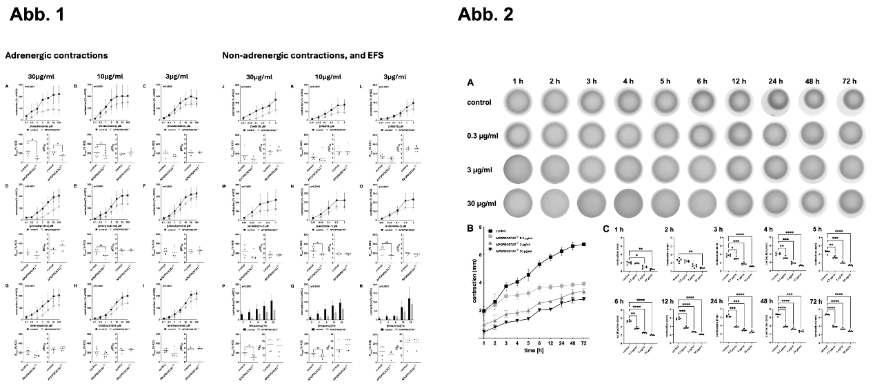Methode: Apoprostat® forte-Kapseln haben mit einem Gehalt von >70% β-Sitosterol (ethanol-extrahiert aus Kiefernrinde, Pinus pinea) die höchste Phytosterolkonzentration am deutschen Markt und wurden für die Versuche in Ethanol (10 ml Ethanol/Kapsel) gelöst. Das verwendete Gewebe wurde aus Prostatektomiepräparaten von Patienten, die sich einer radikalen Prostatektomie aufgrund eines Prostatakarzinoms unterziehen mussten (n=100). Die Kontraktilität von Gewebestreifen wurde im Organbad untersucht und durch Matrix-Kollagen-Assays an Kulturen aus WPMY-1 Zellen ergänzt.