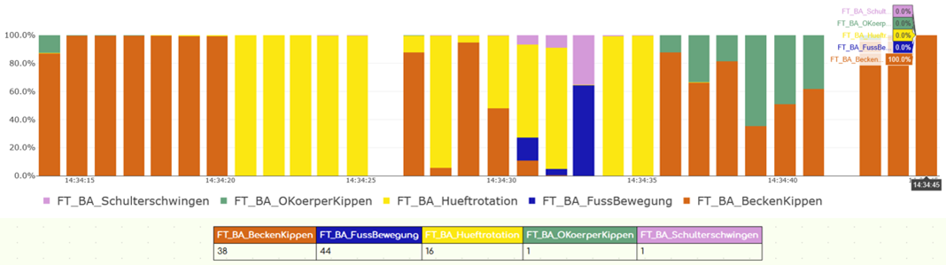 Ein zentrales Ziel der Untersuchung ist die Analyse der Unterscheidbarkeit identischer Bewegungen an unterschiedlichen Körperpositionen. Hier zeigt sich, dass Bewegungen wie Beckenkippen, Hüftrotation und Oberkörperneigung über alle Sensorpositionen hinweg besonders gut erkennbar sind. Die höchste Klassifikationsleistung wird regelmäßig bei einer Platzierung der Smartwatch im Brustbereich erzielt. Bewegungen im Bereich der Extremitäten, insbesondere an den Füßen, können dagegen aus zentralen Körperpositionen nur eingeschränkt erkannt werden. Besonders auffällig ist der Leistungsabfall bei der Fußbewegung, wenn der Sensor sich am Abdomen befindet. Hier sinkt die Genauigkeit auf nur 64.55 %.
