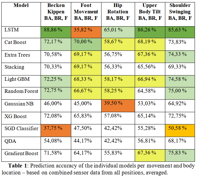 Im Gegensatz dazu fällt die Erkennungsgenauigkeit bei peripheren Bewegungen wie der Fußstreckung deutlich geringer aus, insbesondere wenn die Sensoren nicht direkt an der unteren Extremität angebracht sind. So erreicht das LSTM-Modell bei der Fußbewegung lediglich 35.82 % Genauigkeit, während andere Algorithmen, etwa CatBoost, für dieselbe Bewegung deutlich bessere Ergebnisse erzielen. CatBoost kann hier eine Genauigkeit von 70 % erreichen, was die Bedeutung einer differenzierten Modellauswahl je nach Bewegungstyp verdeutlicht.