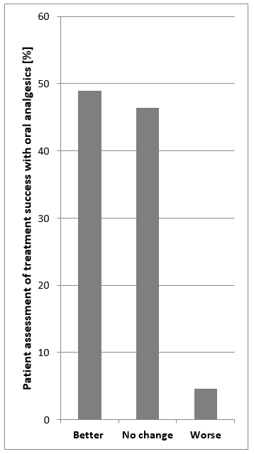 Healthcare providers recommend a variety of pain medications in BPS/IC. Assessments of the therapeutic success of oral analgesics made by patients reveal that almost 50% report an improvement in pain, whilst 46% report no change and 4% of patients report a worsening of their pain (Figure 3). This suggests that self-management of pain also contributes significantly to the successful treatment of symptoms. Aside from pharmacological therapy, patients should also seek options that will enable them to best deal with their pain. Pain management should be based on the experience of the patient. In addition, alternative treatments such as acupuncture, homeopathy and hypnosis might be considered as other means of reducing pain. Music therapy is another way to alleviate pain. The right music can soothe the soul, overwriting an individual’s “pain memory” with music to create positive impressions and experiences [4], [8], [9], [55].