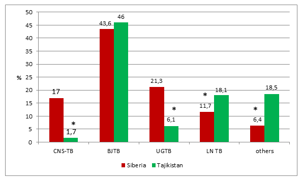 Results: In Siberia the most common form was bone and joint tuberculosis (BJTB) – 43.6%, followed by urogenital tuberculosis (UGTB) – 21.3%, and tuberculosis of the central nervous system (CNS-TB) – 17.0%. In Tajikistan the leading localization was also BJTB (46.0%), followed by tuberculosis of peripheral lymph nodes (LNTB) – 27.7%, whereas the percentage of UGTB was only 6.1%. Patients combining EPTB and HIV infection were 36.8% in Siberia but only 3.5% in Tajikistan. CNS-TB was the predominating localization in patients with HIV infection in Siberia (38.3%), while in Tajikistan LNTB and BJTB (37.9% and 31.0%, respectively) were the most common sites. UGTB was the rarest form among HIV-infected patients reported in both regions.