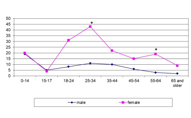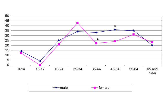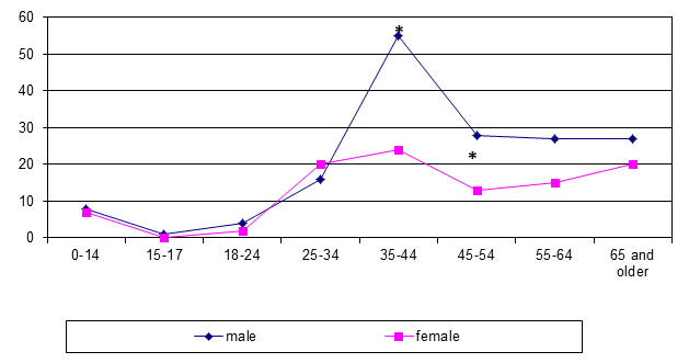 Even larger differences were found in the sex-age structure of patients with LNTB. In Siberia, LNTB was seen mostly in men of 25–44 years (p <0.001; figure 6) while it was diagnosed in the younger range (18–34 years) in females in Tajikistan (p <0.001; figure 7). In some cases, the patients presented late with already established fistulous forms.