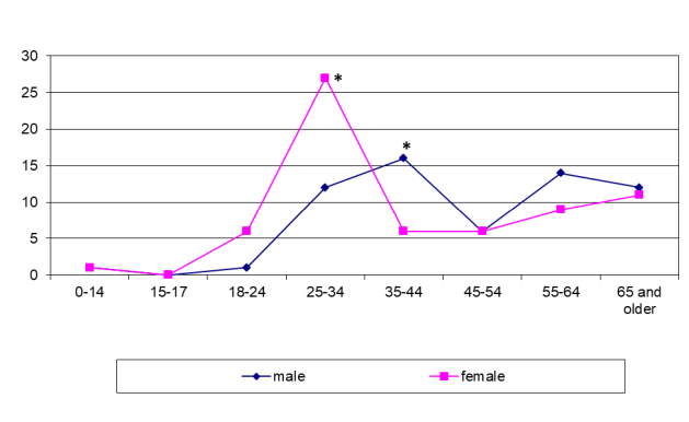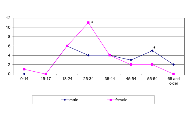 Even more striking differences were found in the sex-age structure of patients with LNTB. LNTB was seen in Siberia mostly in men of 25–44 years while it was diagnosed in the younger range (18–34 years) in females in Tajikistan (figure 6 and figure 7). In some cases the patients presented late with already established fistulous forms.