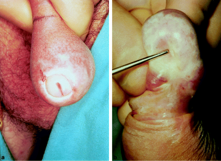 Lichen sclerosus can be the cause of pathological phimosis, which arises from secondary cicatrization of the foreskin orifice. In one study, lichen sclerosus was felt to be responsible for secondary phimosis in all pediatric patients who underwent circumcision [92]. In another study 37% of pediatric patients with severe phimosis had lichen sclerosus [95]. A different study found lichen sclerosus in 60% of boys with acquired phimosis and in 30% of those with congenital phimosis [93]. Even more of the boys presented with inflammatory features of the foreskin (88% and 82%, respectively). The study also examined boys with congenital hypospadias, 61% showing symptoms of inflammation and 15% had features consistent with lichen sclerosus. In one series from Boston, of 41 pediatric patients with lichen sclerosus, 52% had been referred for phimosis, 13% for balanitis and 10% for buried penis [96].